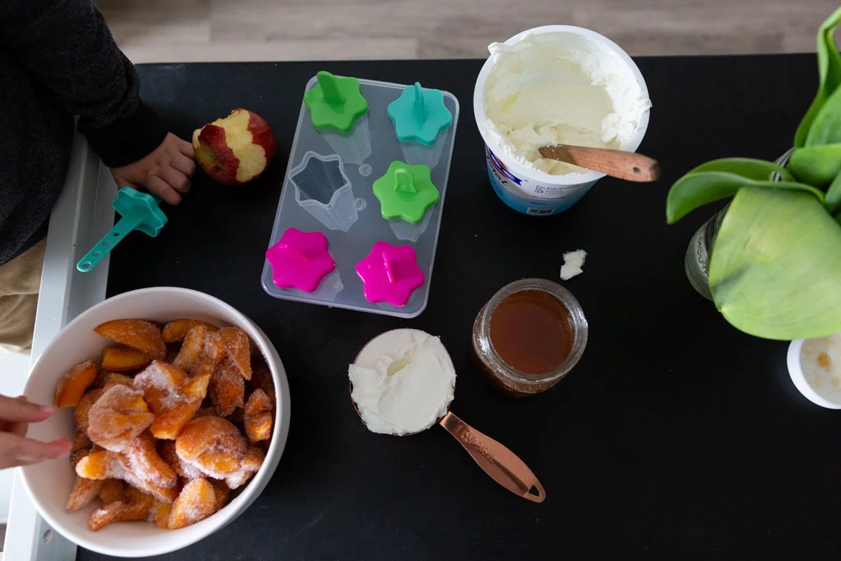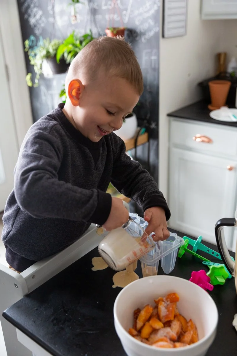 Our sweet neighbors give us peaches from their tree and the weather is finally warming up so it’s time for popsicles! We purchased popsicle molds from TJ Maxx for right around $5. This recipe uses peaches since we had them but you can use any berries that you love. We certainly change up this recipe whenever we like and with whatever’s in season.