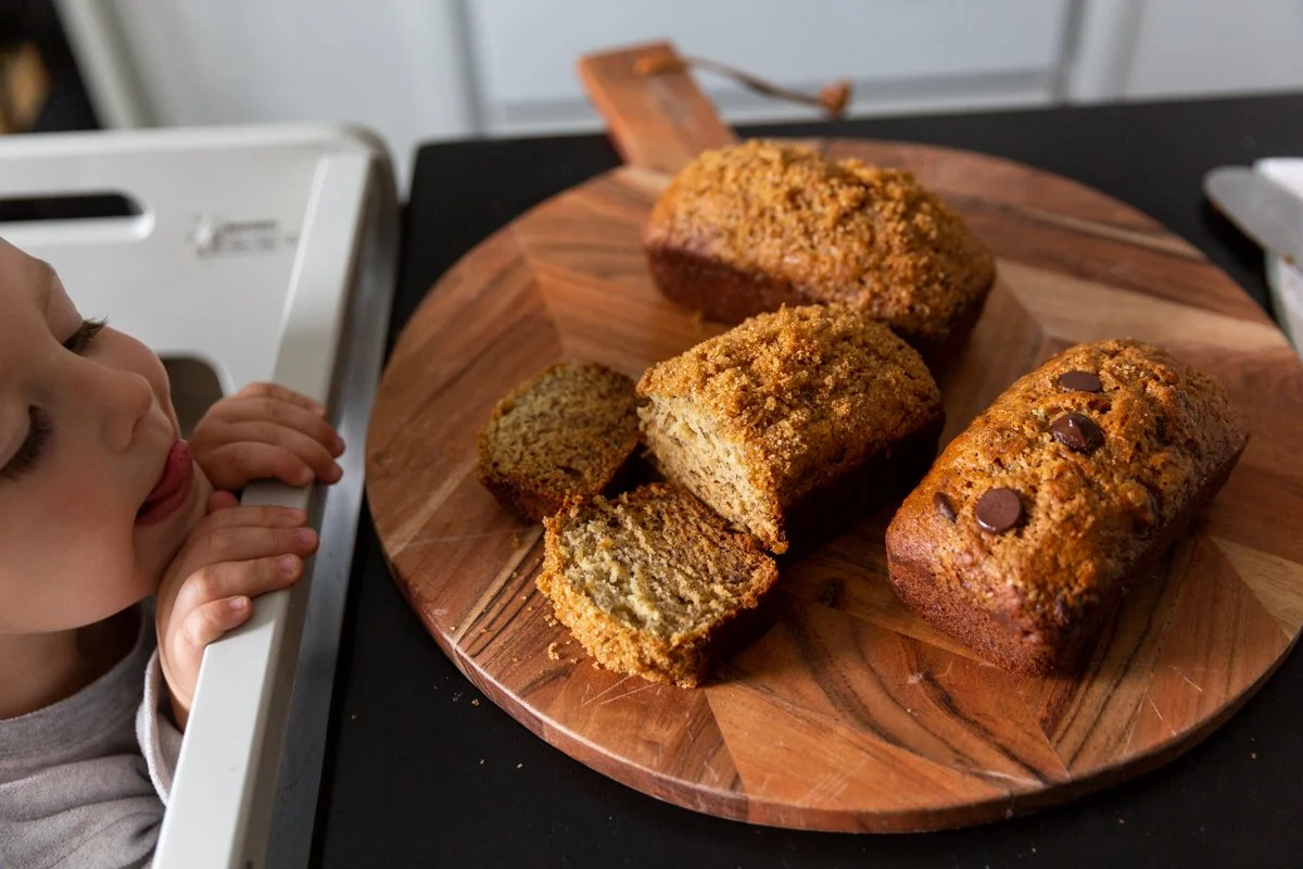 You always, always want to begin by mixing the melted butter, erythritol(or sugar), bananas and vanilla first. Then add your flour, baking soda and salt. And if you have littles at home, let them “decorate” the tops of the loaves with the brown sugar & chocolate chips. Ethan would never eat banana bread with chocolate chips so we personalize the loaves accordingly.